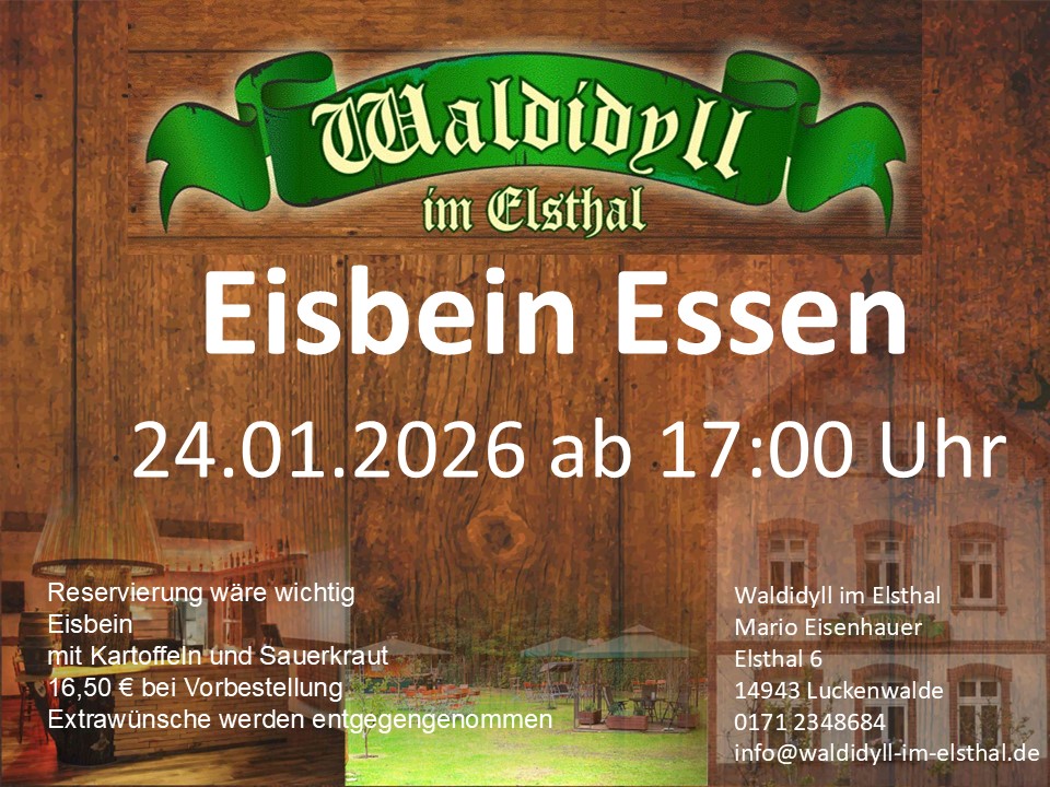 Meldet euch zum Eisbeinessen bei mir an, ihr bekommt wie immer ein großes Eisbein + 1kg dazu reichen wir Sauerkraut und Salzkartoffeln, auf Anfrage gerne Schwarzbrot. Wir starten um 17:00 Uhr, sollte jemand kein Eisbein mögen, könnt ihr gerne etwas anderes bestellen. Bei der Reservierung können wir alles abstimmen.